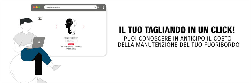 Il proprietario di un fuoribordo Suzuki, collegandosi all’apposito configuratore presente nel sito Suzuki Marine – https://marine.suzuki.it/dealer/pricing.aspx - in pochi attimi, autonomamente, può calcolare in anticipo il costo di ogni manutenzione. Si può innanzitutto scegliere l’officina più congeniale alle proprie esigenze, in base alla località e ai servizi erogati, e poi, dopo aver selezionato quale tipo di motore si possiede, selezionare il tagliando necessario in base alle ore o alle stagioni di utilizzo, ottenendo il preventivo dettagliato: ore necessarie alla manutenzione e costo della mano d’opera, litri d’olio necessari e costo al litro, costo dei vari filtri, guarnizioni, candele, anodi o di qualsiasi altro materiale di consumo sia prevista la sostituzione. Tutto è evidenziato nel dettaglio di una schermata molto chiara anche dal punto di vista grafico, che il Cliente può stampare e portare direttamente con sé dal concessionario.