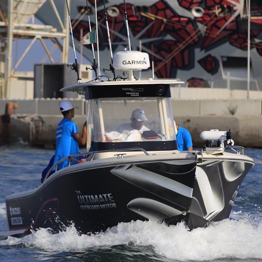 Nello specifico, Volpi ha scelto di motorizzare il proprio Tuccoli VM250 con un Suzuki DF300AP, un fuoribordo potente e affidabile, che cela un motore DOHC 6 cilindri da 4.028 cc con 300 CV e 6 valvole per cilindro. Questo modello è dotato del sistema Suzuki Selective Rotation, che consente di selezionare il senso di rotazione dell’elica in modo da far funzionare il piede, alternativamente, sia come rotante, sia come controrotante.