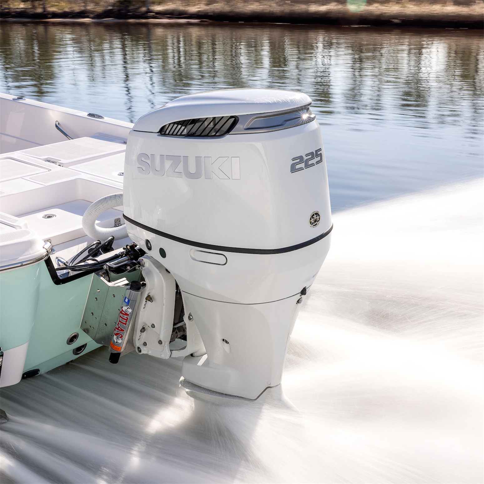 Sotto la calandra, il DF225 monta un potente motore a 6 cilindri da 3.614 cc con 4 valvole per cilindro e doppio albero a camme in testa. È dotato di asse di trasmissione disassato rispetto all’albero motore, il che permette di avere una prima riduzione tra albero motore e albero di trasmissione ed una seconda riduzione tra albero di trasmissione e la scatola ingranaggi all’interno del piede. Questo meccanismo sposta in avanti il baricentro conferendo al motore maggiori equilibri, minori vibrazioni e maggiore stabilità durante la guida; inoltre, consente di montare eliche con diametri maggiori per sfruttare al massimo l’efficienza propulsiva del motore.