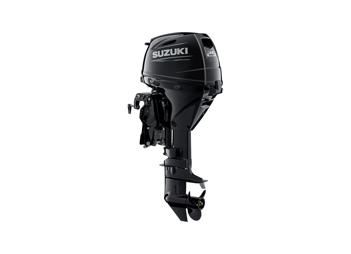 Il Suzuki DF25A monta un motore a tre cilindri da 490 cc ed è il fuoribordo più leggero della sua categoria. E’ inoltre il primo ad avere la distribuzione con bilancieri provvisti di roller che utilizzano l’albero motore disassato. Posizionandolo leggermente decentrato rispetto al cilindro, la pressione laterale contro lo stesso viene ridotta incrementando notevolmente l’efficienza di funzionamento.