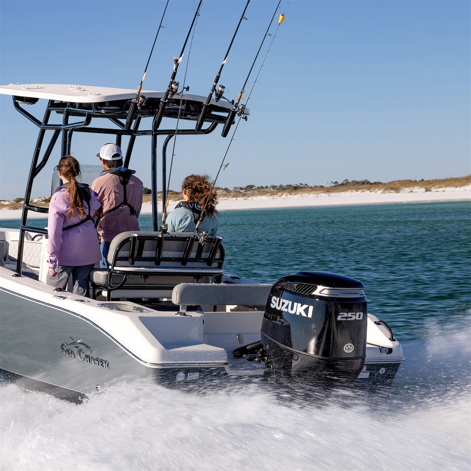 Sotto la calandra, il DF250 monta un potente motore a 6 cilindri da 3.614 cc con 4 valvole per cilindro e doppio albero a camme in testa. È dotato di asse di trasmissione disassato rispetto all’albero motore, il che permette di avere una prima riduzione tra albero motore e albero di trasmissione ed una seconda riduzione tra albero di trasmissione e la scatola ingranaggi all’interno del piede. Questo meccanismo sposta in avanti il baricentro conferendo al motore maggiori equilibri, minori vibrazioni e maggiore stabilità durante la guida; inoltre, consente di montare eliche con diametri maggiori per sfruttare al massimo l’efficienza propulsiva del motore.