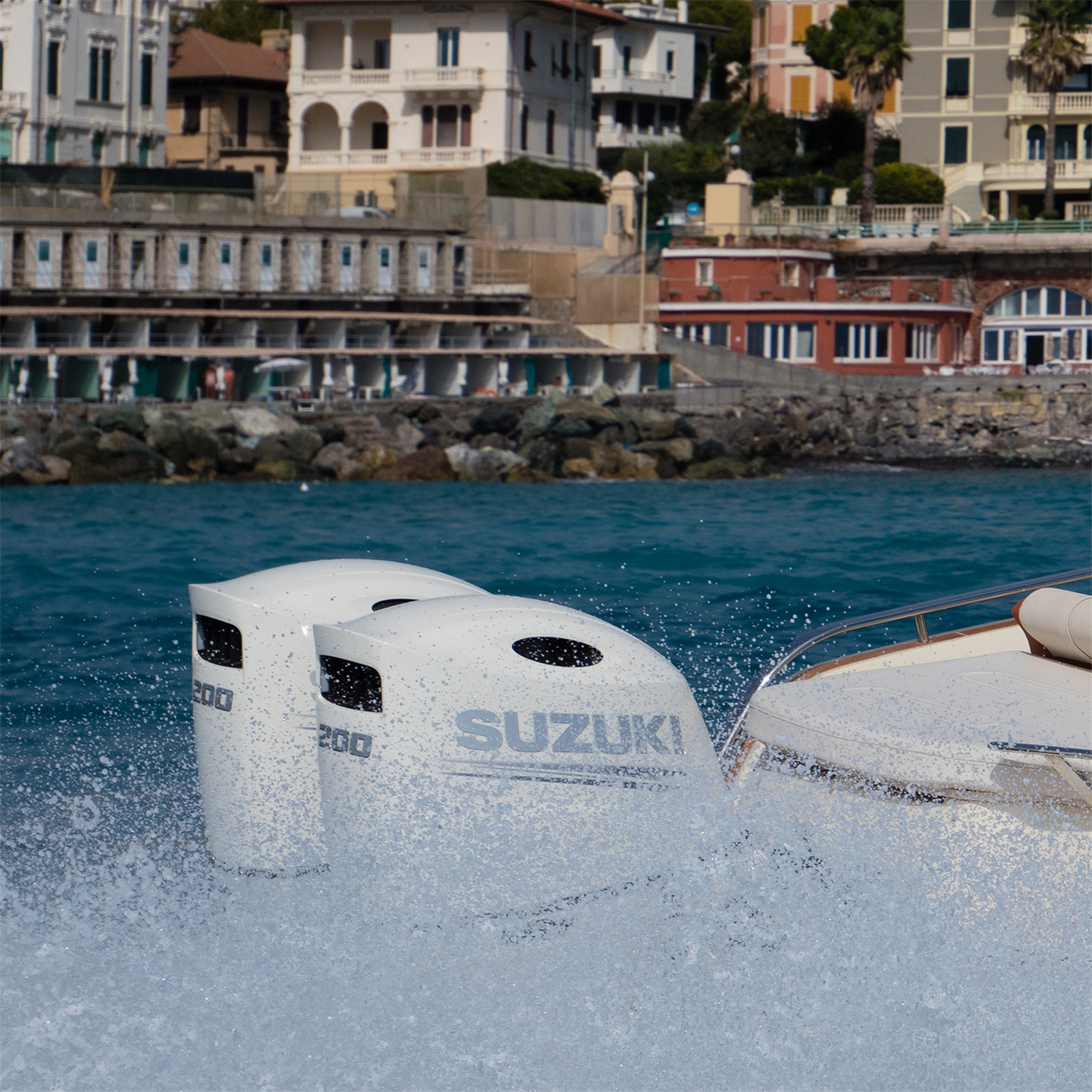 Il Suzuki DF200A monta un motore DOHC 16 valvole da 2.867 cc con elevato rapporto di trasmissione a 10,2:1. E’ dotato di asse di trasmissione disassato rispetto all’albero motore, il che permette di avere una prima riduzione tra albero motore e albero di trasmissione ed una seconda riduzione tra albero di trasmissione e la scatola ingranaggi all’interno del piede. Questo meccanismo consente di montare eliche con diametri importanti per sfruttare a pieno l’efficienza propulsiva del motore. Inoltre, sposta in avanti il baricentro conferendo al motore maggiori equilibri, minori vibrazioni e maggiore stabilità durante la guida.