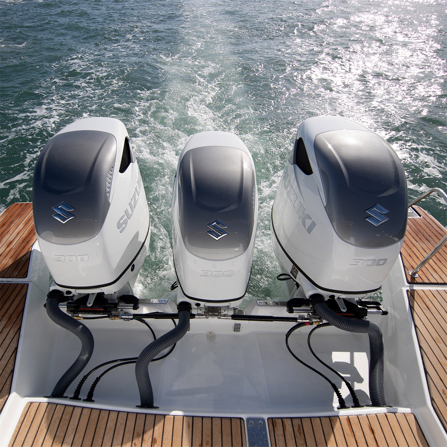 E' dotato di un potente motore DOHC 6 cilindri da 4.390 cc con 300 CV e un rapporto di compressione di 12,0:1. Rapporto generalmente riservato a unità termiche da competizione, il più alto per un fuoribordo prodotto in serie.